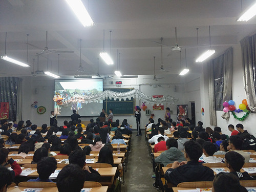 宣讲会现场,气氛良好,秩序井然。大一的新生们都很热情,会议的主要内容是:介绍龙狮协会的发展历程、,平时的训练时间,队伍构成。当然,口头介绍完了各个队伍之后自然少不了现场表演,龙狮队员卖力的演出博得了大家一阵阵热烈的掌声,我们可以看到萌萌的狮子手舞足蹈,热络地和同学们互动。
