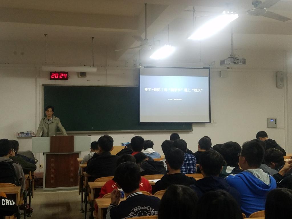 为庆祝学校成立六十二周年,促进2018级新生知校史明校情,学院于11月11日校庆日晚19:30,在雁山校区教六栋组织学院全体2018级新生同上一堂“知校史、明校情”学习课,本次学习课由学院学工组长饶蠡和辅导员肖利斌主讲。 学习课上,饶蠡老师简要介绍了学校六十二年的发展历程,“十易校名”和“五改归属”的由来。并通过自己十六年来在学校学习和工作的亲身经历,讲述了学校的发展和变化以及对“桂工精神”认识。鼓励学院2018级的全体同学要多了解学校的历史,以学校为荣,提升自我,为校争光,为祖国的发展尽力。之后,肖利斌老师展示了学校四个校区的新、旧照片,分享了学校校园的变化。 整个课堂,两位老师以故事为切入点讲述校史校情,幽默风趣,引得同学们笑声连连,让同学们在轻松愉快的氛围中了解学校。学院也将以此次课堂为始,在今后的2018级新生教育中,通过多形式加强校史校情教育,引导学生爱校、知校、荣校。