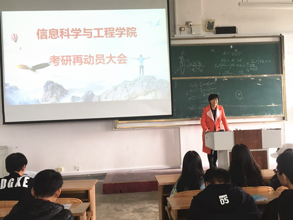 为进一步推动我院学生的考研热情,让学生更加明确目标,了解更多考研信息,挖掘自己的潜力。10月16日下午,我院2015级考研再动员大会在教6栋06208教室举行。学院副院长谢晓兰、副院长董明刚,学院党委副书记刘志丽参加了此次会议。 会议伊始,刘志丽副书记通报了截止目前我院报名参加考研学生的情况,希望同学们明确自己的考研目标,调整好心态,坚持不懈的实现考研目标。 谢晓兰副院长介绍了我院的基本情况,肯定了我院在近几年专业领域所取得的成绩,随后,从培养计划、奖学金设置、导师设置、就业情况等方面出发,进行了较为详细的阐述,对我院近几年研究生的专业设置及招生情况进行了深入分析。希望同学们结合当下的考研形势,合理选择院校专业,认真复习,全力以赴备战考研。 随后,董明刚副院长就我院以往考研情况向大家做了介绍,鼓励同学们要加强考研的信心,刻苦学习,坚持不懈的实现考研目标。 通过这次动员大会,希望有更多的同学能够加入到2018年的考研行列中来,并希望报考研究生人数能够取得新的突破。