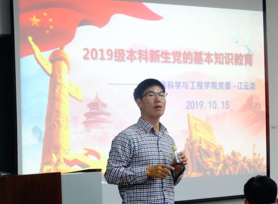 2019年10月15日,学院党委江云清书记对2019级全体新生进行了入党启蒙教育。 江书记从“中国共产党发展历史”、“为什么争取入党”、“新时期我们党为什么重视在大学生中发展党员”、“如何入党”多维度地为新生进行介绍讲解。江书记以中华人民共和国成立70周年为切入点,从一大到十九大,回溯党的光荣历史,让新生们对中国共产党有了更深入的了解。江书记详细介绍了“入党申请人-入党积极分子-党员发展对象-预备党员-正式党员”的入党程序,指出了撰写入党申请书的基本格式和需要注意的问题,引导同学们树立正确的入党动机,激励同学们积极向党组织靠拢,作为社会主义建设者和接班人,努力发挥自己最大的价值。 学院党委江云清书记给2019级学生开展入党启蒙教育 图文来源:冯思豫