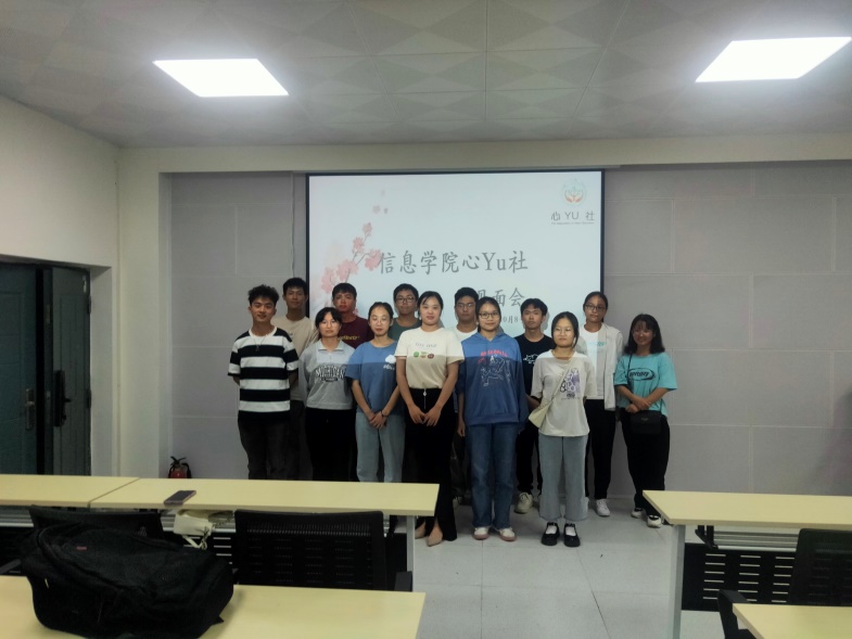 2021年10月8日20:00至22:00,第一届信息学院心Yu社全体成员见面大会在雁山校区立信楼02525举行。出席本次见面会的有心Yu社指导老师陈千癸以及心Yu社全体成员,会议由心Yu社会长团成员李芳主持。 见面会伊始,主持人向参加会议的新老成员表示热烈的欢迎,并向大家讲述了心Yu社的创办历程。随后,指导老师陈老师发言,陈老师指出,信息学院心Yu社是于2021年5月25日创办成立的,“525”与“我爱我”同音,选在这一天,是希望信息学院的所有学生都能够自尊、自爱、自信。而心Yu社存在的价值和意义就是“陪伴大家共同成长”。发言最后,陈老师指出,心Yu社的每一位成员都要积极行动,践行组织的育人宗旨,为学院学生的心理健康作出贡献。 最后,心Yu社会长团全体成员向大家进行了自我介绍,并阐述了各部门的工作职能。与此同时,所有新成员也进行了自我介绍。期间,主持人组织了“交换名字”和“喊数字”等游戏,通过设置有趣的奖励和惩罚环节,加强了成员们彼此的了解和默契度, 增加了他们对心Yu社的热情和积极性, 让新成员感受到了心Yu社大家庭的温暖, 并将整个见面会的气氛推向了高潮。通过这次活动,心Yu社成员之间有了初步的了解,也为今后学院心理工作的开展打下了良好基础。
