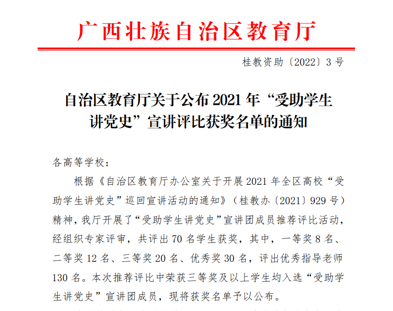 学院学子薛淇升同学喜获广西区教育厅2021年“受助学生讲党史”三等奖