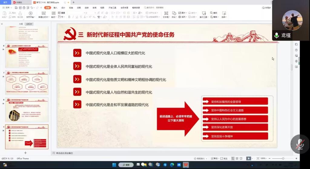 为深入学习贯彻党的二十大精神和习近平总书记系列重要讲话精神,11月22日,计算机第一学生党支部开展“深入学习贯彻党的二十大精神”主题党日活动。受疫情影响,本次活动转为线上,支部全体党员参加,支部副书记钟美薇主持。 钟美薇同志领学了党的二十大报告原文,全面回顾党和国家自十九大以来取得的伟大历史成就和新时代十年的伟大变革,科学擘画了未来中国的发展蓝图。着重学习了关于“实施科教兴国战略,强化现代会建设人才支撑”篇目。钟美薇强调,科技是第一生产力,人才是第一资源、创新是第一动力,党对青年寄予厚望,同志们要认真领会领悟党的二十大精神实质,不断从中国共产党的发展历程中汲取经验,把理论学习与自己的学习生活相结合,在感悟中学、在实践中学,坚持自主创新,争做担当民族复兴大任的信息化时代新人。 此次主题党日活动的开展,同志们更加深刻地认识到作为新时代的新青年,要坚定不移听党话、跟党走,怀抱梦想又脚踏实地,敢想敢为又善作善成,立志做有理想、敢担当、能吃苦、肯奋斗的新时代好青年,让青春在全面建设社会主义现代化国家的火热实践中绽放绚丽之花。 线上主题党日活动