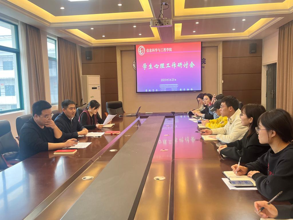 为更好开展学院心理健康教育工作,提升学院心理育人实效,3月23日,学院召开2023年学生心理工作研讨会,学院党委副书记宋玉辉出席会议并讲话,全体辅导员参加会议。 首先,学院心理专项辅导员王东京汇报了2023年学校心理专项工作内容和学院心理专项工作计划。随后,宋玉辉副书记就2023年学院心理健康工作提出了四点要求:一是各年级辅导员要提高政治站位,高度重视心理健康教育工作,以生为本,提高服务水平。二是加强规范,落细心理筛查。三是加强心理工作队伍的建设,辅导员要努力提升自身的心理素质及工作能力,同时加强对朋辈心理委员的培训,提高朋辈心理辅导能力。四是在心理工作实践中,凝练特色,加强成果转化。 此次学生心理工作研讨会为做好2023年学生心理健康教育工作提供了方向指引,对提升学院心理育人成效具有重要意义。 会议现场