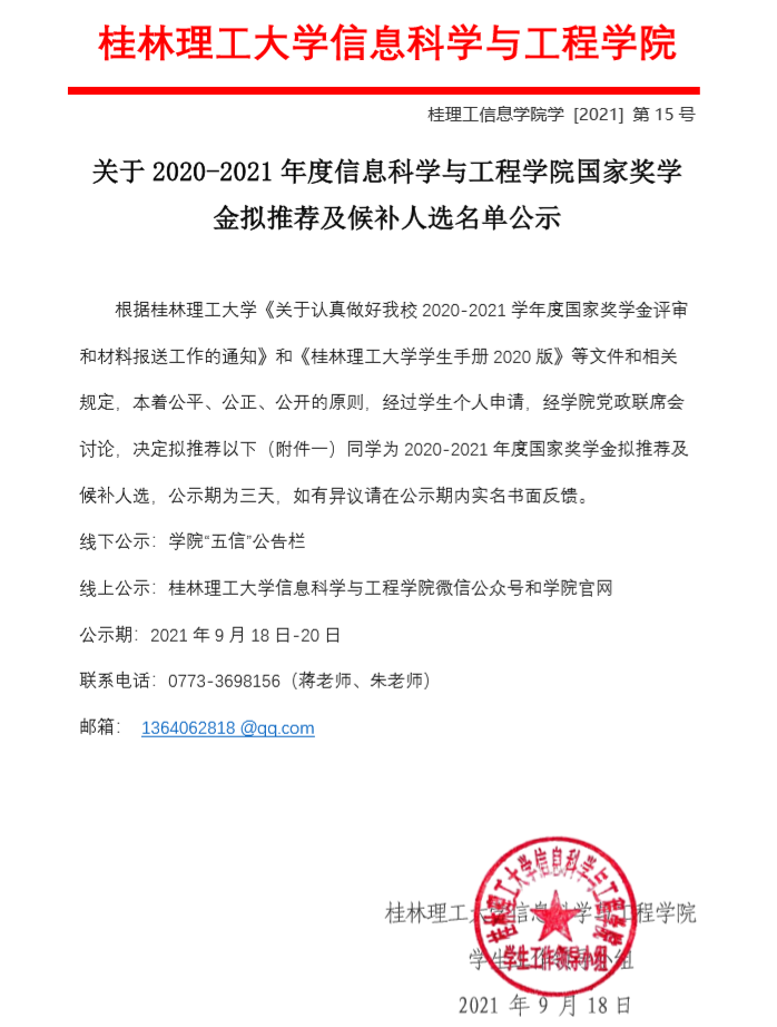 关于2020-2021年度信息科学与工程学院国家奖学金拟推荐及候补人选名单公示