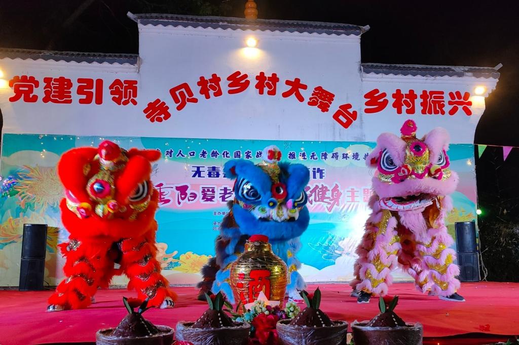 为发扬中华民族敬老爱老的传统美德、丰富和发展传统龙狮文化,10月23日,学院龙狮协会的同学们在于帅帅老师的带领下,趁着暮色来到了会仙镇乡村振兴晚会的现场,为会仙社区的居民带来了一场热闹非凡、震撼人心的龙狮展演活动。 抵达会仙社区后,同学们为会仙社区居民进行了祈福活动,瑞狮跟随着震撼的鼓点舞动跳跃,为农户祈望生活吉祥如意、事事平安。龙狮展演在震撼磅礴的鼓声中拉开序幕。龙狮协会为现场群众展示“群狮报喜”“瑞狮点睛”“麒麟步”“挂腰接上腿”“高狮”等一系列龙狮表演动作,时而昂首阔步,时而翻腾扭转,一幕接一幕将狮生动的生态展现得淋漓尽致。高超的技艺赢得了现场群众的一片喝彩,展现了龙狮人坚韧不拔、勇往直前的精神面貌,也进一步点燃了大家的激情。 经过此次活动,我们弘扬了重阳节爱老敬老的传统美德,也传播了中华传统的龙狮文化,让居民更好地感受龙狮优秀传统文化的底蕴和魅力,增强文化自信,让传统文化焕发新的活力,培养新时代文化传承接班人,实现了龙狮文化与爱老敬老的精彩联动。 学院展演人员 展演现场 活动合影